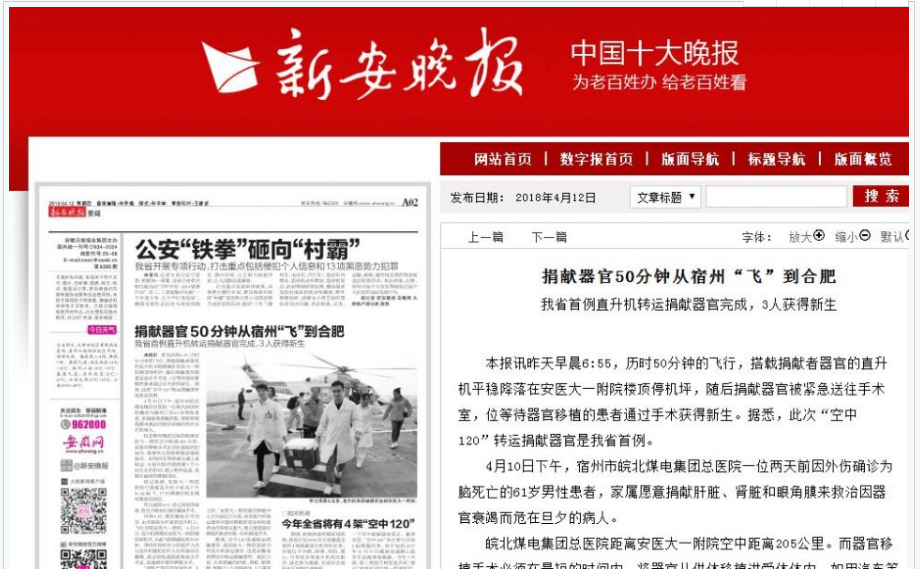 新安晚报:捐献器官50分钟从宿州“飞”到合肥