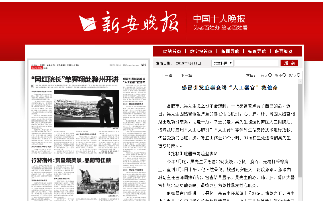 今年3月底,吴先生因感冒出现发烧、心慌、胸闷、无精打采等病症。直到4月1日中午,他突然晕倒,被送到安医大二附院急诊。急诊内科副主任医师周姝介绍,检查结果显示,吴先生的心、肺、肝、肾四大器官相继出现功能衰竭,最终判断为急性暴发性心肌炎。