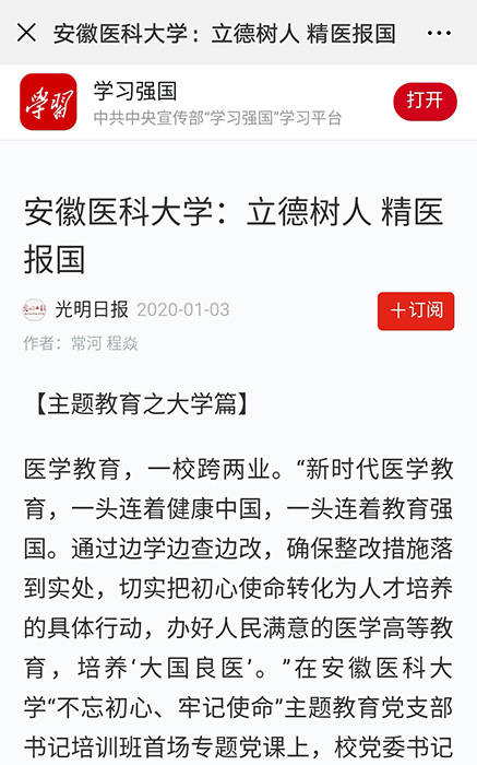 学校党委注重发挥先进典型引领作用,在组织学习李夏、黄文秀等先进典型的同时,举办模范教师报告会,刊印《精医报国铸初心》,汇编60个先进典型事迹,用身边的人和事教育身边的人。