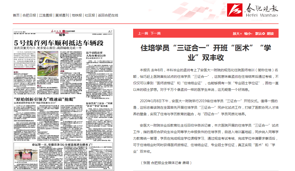 合肥晚报:住培学员“三证合一”开班“医术”“学业”双丰收
