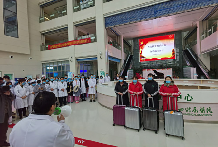 出征前,医院领导和医护员工为队员们送行,叮嘱大家一定要做好个人防护出色完成任务,展现安医大的风采。