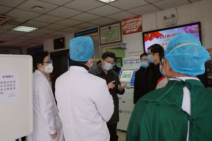 汪凯仔细查看了该院预检分诊工作的实际情况,对分诊点人员值守、消毒防护、患者分诊及急诊处置等情况作了深入了解。在认真听取院领导关于该院近期疫情防控工作的汇报后,他对春节期间仍坚守岗位,奋战在一线的医务人员表示亲切慰问,对医院前期疫情防控工作表示肯定。