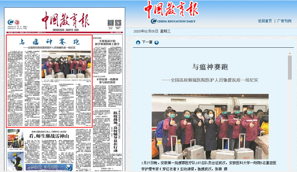 中国教育报:与瘟神赛跑 ——全国高校附属医院医护人员驰援抗疫一线纪实(头版头条配图)