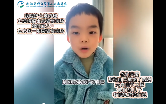 新安晚报 安徽网 大皖客户端讯 元宵佳节,千家万户团圆时。而此时此刻,安医大二附院隔离病房的主管护师戴秀璟和她的爱人分别坚守在二附院和一附院抗击疫情的第一线。他们的孩子,有话想对今天回不了家的爸爸妈妈说…(新安晚报 安徽网 大皖客户端记者 陈牧
