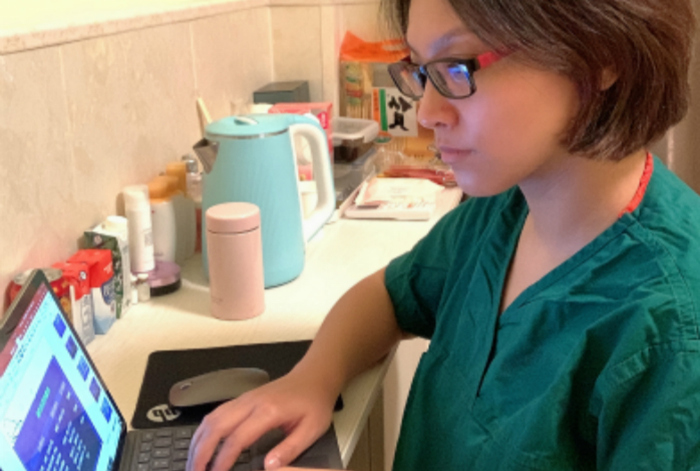 2月13日凌晨,接到医院集结医护人员驰援武汉通知,许敏主动报名。虽没有被安排前往武汉,但连夜被安排到了本院的新冠肺炎隔离病房支援一线工作。作为内科教研室秘书,在一线抗疫工作同时,许敏还承担着开学前2周协调内科学教研室相关教师参加线上教学培训工作。同时,作为一名高年资教师,她本学期承担着《诊断学》课程的部分教学任务,而课程时间恰巧都是在隔离病房工作期间,如何兼顾隔离病房特殊性同时又能很好完成线上教学工作,是摆在她面前的一个难题。