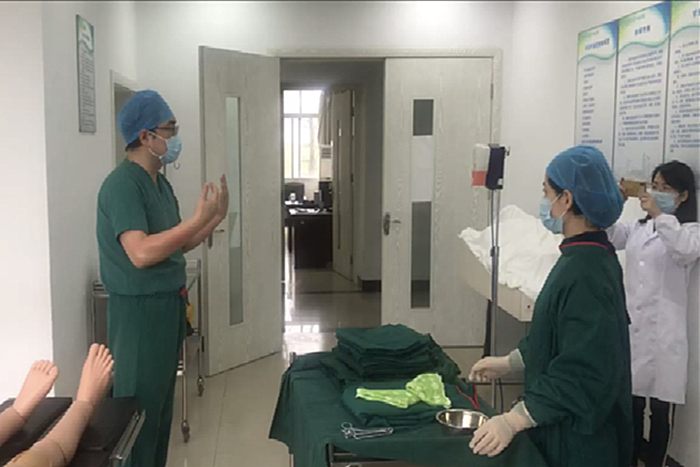 眼看着医院理论课线上教学开展得如火如荼,善于创新的临床技能中心主任张志功再也坐不住了。他主动与本学期有《临床技能训练课》的2016级临床医学“5+3一体化”的同学们取得联系,在得知学生们希望提前熟悉课程内容后,他立即召集中心人员深入讨论了线上实验课开展的可行性。经过慎重考虑,选择了学生在家就能自行练习的七步洗手法、消毒铺巾、换药、打结等训练项目作为课程前预习课。