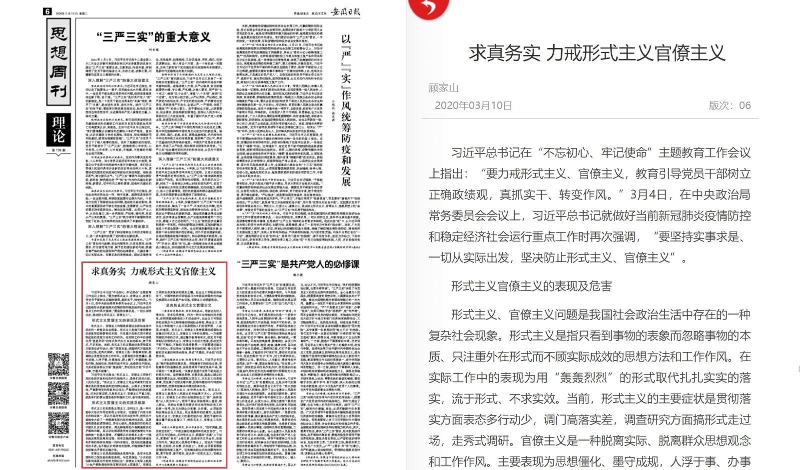习近平总书记在“不忘初心、牢记使命”主题教育工作会议上指出:“要力戒形式主义、官僚主义,教育引导党员干部树立正确政绩观,真抓实干、转变作风。”3月4日,在中央政治局常务委员会会议上,习近平总书记就做好当前新冠肺炎疫情防控和稳定经济社会运行重点工作时再次强调,“要坚持实事求是、一切从实际出发,坚决防止形式主义、官僚主义”。