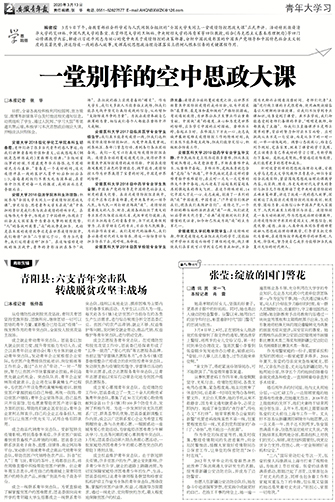 安徽大学2018级化学化工学院本科生胡春霞:老师们讲了很多当代青年的感人事迹,向我们讲解青春的价值和意义,让我想起来《钢铁是怎样炼成的》里面那句经典:“当他回首往事的时候,不因虚度年华而悔恨,也不因碌碌无为而羞耻。”青春是一个美好的词,这次疫情冲在一线的医护人员中90后和00后占1/3,每每看到他们不畏生死为国奉献,在苦难中仍然笑对每一天的报道,我的泪水总是夺眶而出。