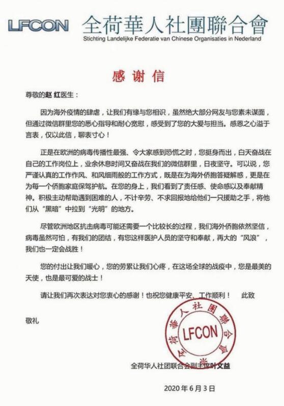 在微信群中,赵红医师对华人华侨的问题逐一解答,耐心疏导,指导他们科学防疫,劝解安抚他们的情绪。一位曾有疑似新冠肺炎症状的荷兰华人在朋友圈这样写道:“刚开始有一些比重感冒轻微的症状,加群后赵医生每天关心和指导,现在的我一天走20公里、一口气跑几公里都没问题。”字里行间,流露出对赵红医生的感激和对自己“绝处逢生”的喜悦。