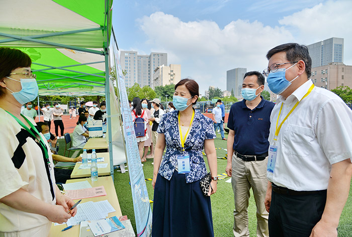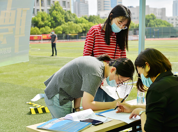 6月19日上午,我校2020年首场线下就业市场在梅山路校区体育场举行。校党委书记顾家山、校长曹云霞,副校长余永强、肖圣龙、吕雄文,校纪委书记黄新美到现场视察,与用人单位和毕业生进行了亲切交流。校党委副书记刘群英指导举办此次就业市场的相关工作。