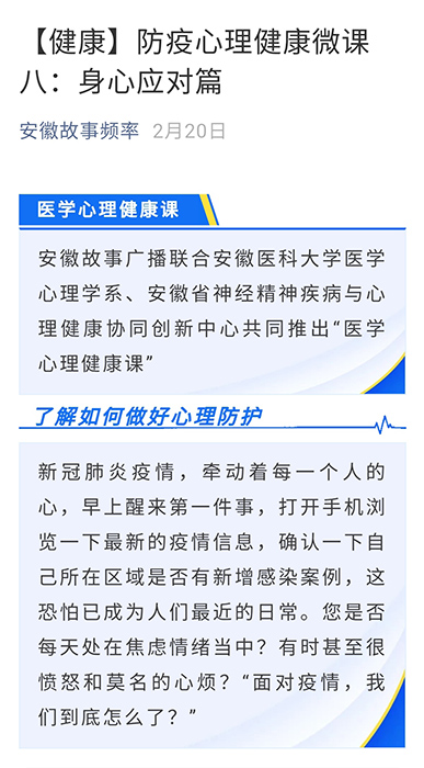 中心还邀请校内心理学专家带领学生开展“云陪伴·心成长”情绪调节线上团体辅导,以“接纳情绪、调节情绪、自我成长”为总体目标,通过正念、认知等心理学方法,帮助我校100名特殊困难学生学习觉察自己的压力,悦纳自己,学习自我压力的调适和情绪的管理。防疫心理健康微课一经推出,得到了社会热烈反响和好评,微信转发量累计超万余次,安徽故事广播和安徽公共频道官方微信也进行了推送。