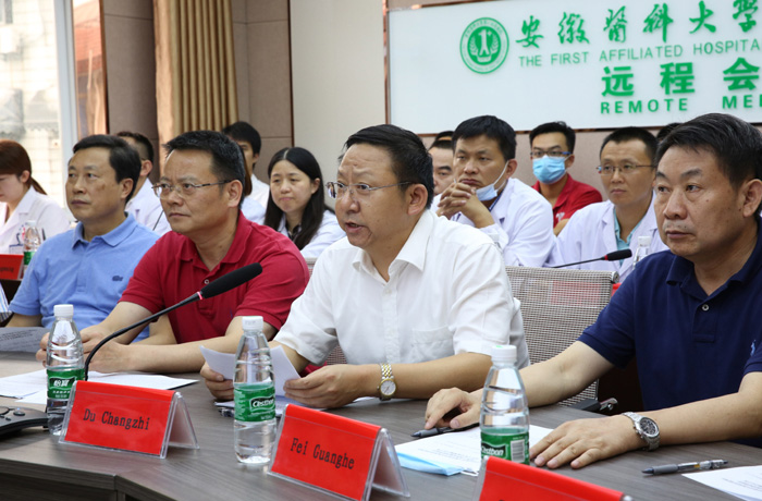 7月2日下午3时(莫斯科时间7月2日上午10时),安徽省与俄罗斯伏尔加河沿岸联邦区新冠疫情防控视频会议在第一附属医院举行。驻喀山总领事吴颖钦,省外办主任雍成瀚、省卫健委副主任杜昌智,一附院院长梁朝朝等院领导及院内多位具有抗击新冠肺炎疫情一线经验的专家,与下诺夫哥罗德州、鞑靼斯坦共和国、萨马拉州、巴什科尔托斯坦共和国、楚瓦什共和国等9个俄罗斯联邦主体50余卫生部官员和医疗专家展开远程视频交流。