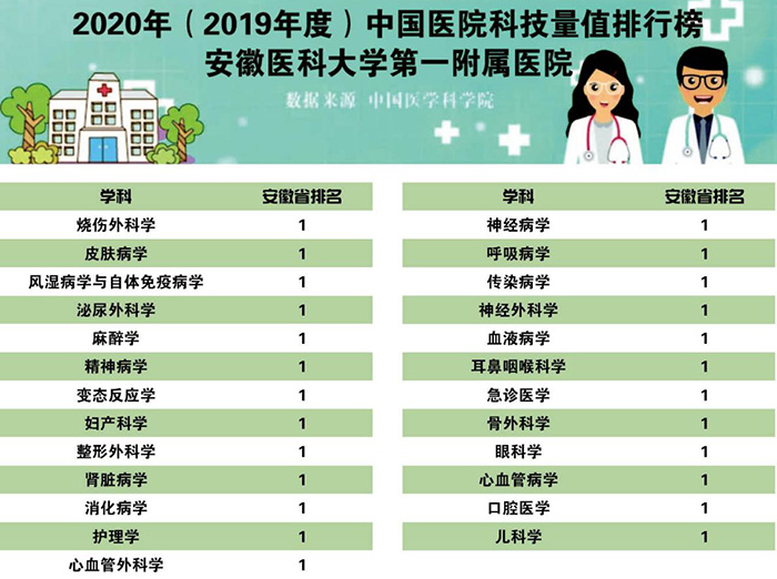 在31个学科榜单中,一附院共有30个学科进入全国前100位,比上年增加3个;25个学科居安徽省第一,比上年增加5个。其中,烧伤外科学(第3名)、皮肤病学(第9名)、风湿病学与自体免疫病学(第16名)、泌尿外科学(第20名)、麻醉学(第22名)、精神病学(第23名)、变态反应学(第29名)、妇产科学(第31名)、整形外科学(第32名)、肾脏病学(第34名)、消化病学(第42名)、护理学(第45名)、心血管外科学(第45名)、神经病学(第46名)、呼吸病学(第50名)等排名全国靠前。