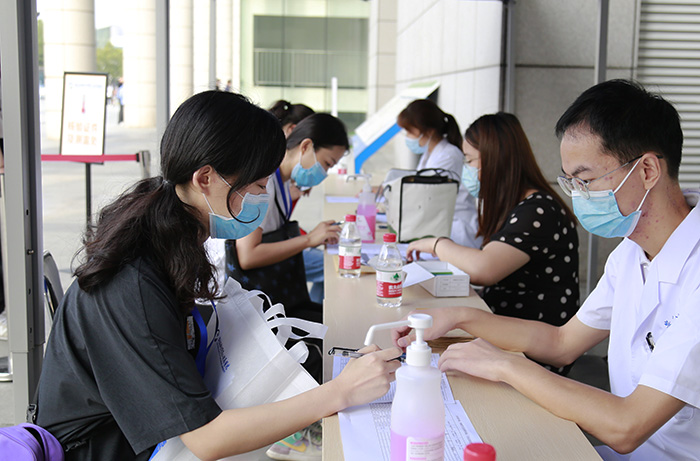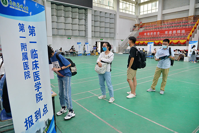 报到当日,校本部研究生新生凭录取通知书、健康码进入校门,经体温检测无异常后进入指定消毒区域,完成行李物品消毒、更换口罩等入校流程。在各培养单位报到点,新生们需核对身份证、毕业证、学位证等证件,领取校园卡、学习资料、防疫物资等物品后,前往宿舍楼办理住宿手续,完成报到手续。南校区研究生新生在我校第二附属医院南广场按照流程完成了报到手续。