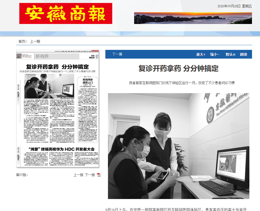 9月16日上午,在安医一附院高新院区的互联网医院体验区,患有高血压的高大爷来开药,导诊何凤云细心地教老人家关注公众号,线上花了一元钱挂号,走进体验区,通过视频与值班医生交流几句,“药已经开好了,您去药房拿吧。下次在家里操作就可以了。”