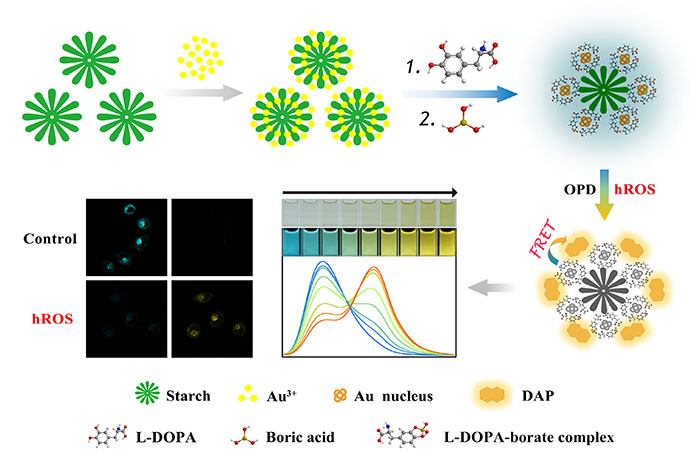 该研究以淀粉为模板,以左旋多巴为还原剂和保护剂,采用硼酸为左旋多巴中邻苯二酚的保护基团,首次成功合成分散性与生物相容性良好、生理条件下稳定的小分子配体荧光纳米金簇。通过引入邻苯二胺作为荧光信号响应试剂,成功构建一种新型纳米金簇/邻苯二胺比率型荧光探针,用于特异性监测细胞内高活性氧水平变化。