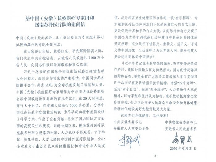 信中指出,中国赴南苏丹、几内亚抗疫医疗专家组作为中非团结抗疫特别峰会后中国政府派往非洲的首批专家组,在20天时间里,穿行8个时区,在非洲大陆驰行5000多公里,分享中国抗疫经验和安徽救治特色,为尽早成功控制疫情提供了科学方案、作出了应有贡献,得到了国内国际方方面面的高度关注和褒奖。