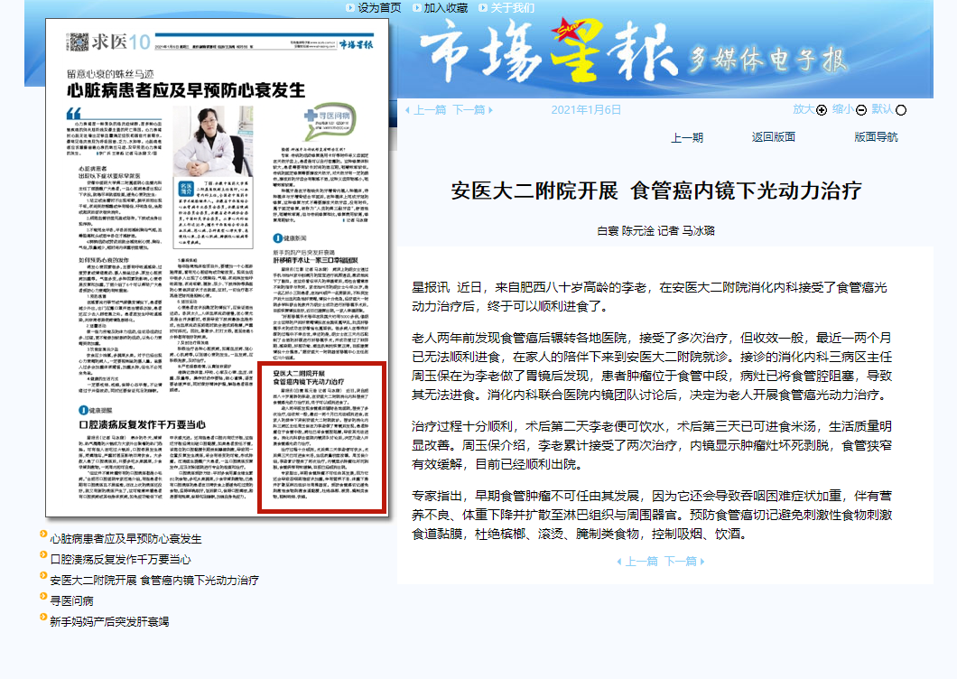 市场星报:安医大二附院开展 食管癌内镜下光动力治疗