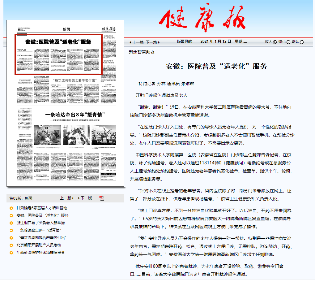 中国科学技术大学附属第一医院(安徽省立医院)门诊部主任鲍萍告诉记者,在该院,除了现场挂号,老人还可以通过118114转0(健康顾问)电话约号或在总服务台人工挂号预约处预约挂号。医院还为老年患者代寄化验单、检查单,提供平车、轮椅,开展陪检服务等。