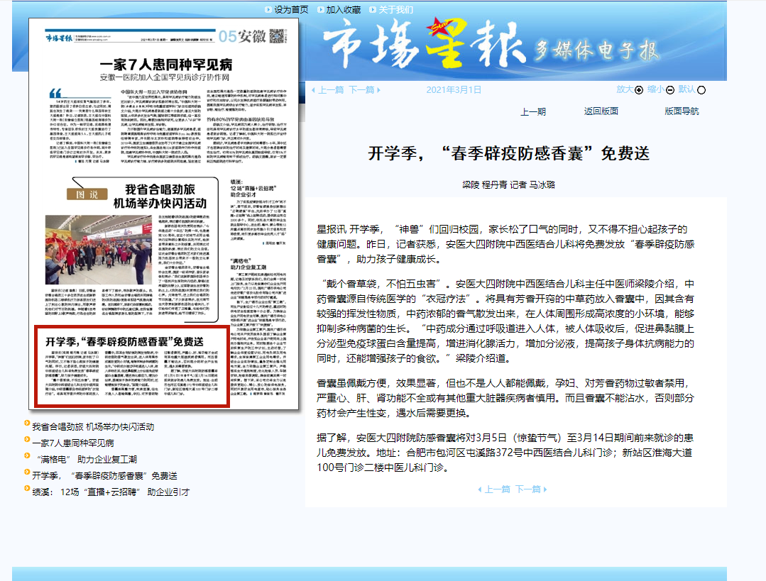 星报讯 开学季,“神兽”们回归校园,家长松了口气的同时,又不得不担心起孩子的健康问题。昨日,记者获悉,安医大四附院中西医结合儿科将免费发放“春季辟疫防感香囊”,助力孩子健康成长。