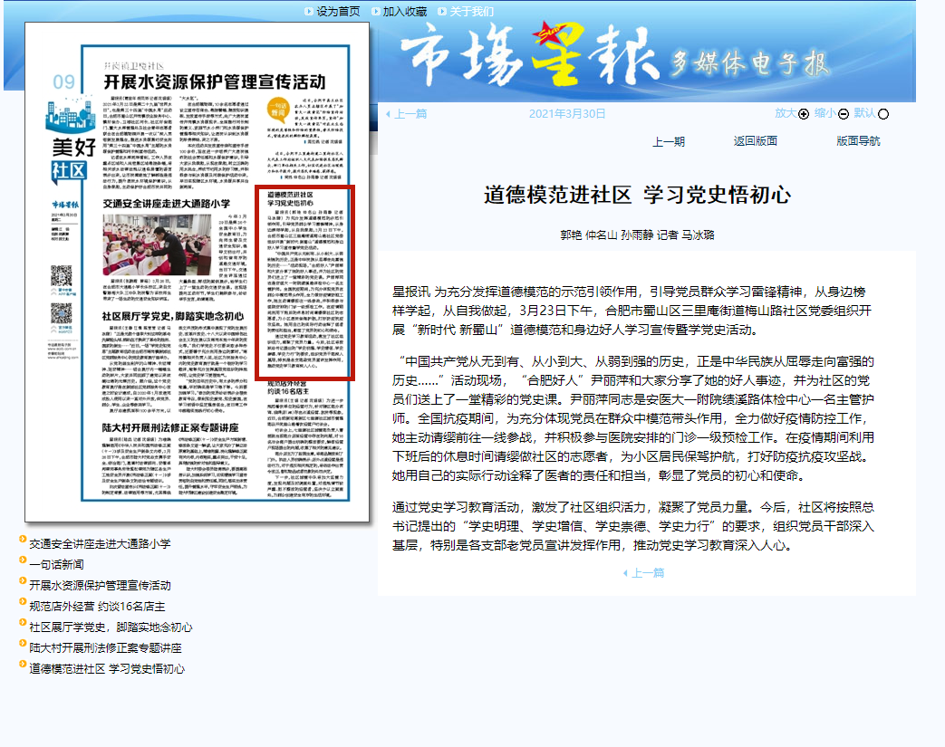 星报讯 为充分发挥道德模范的示范引领作用,引导党员群众学习雷锋精神,从身边榜样学起,从自我做起,3月23日下午,合肥市蜀山区三里庵街道梅山路社区党委组织开展“新时代 新蜀山”道德模范和身边好人学习宣传暨学党史活动。