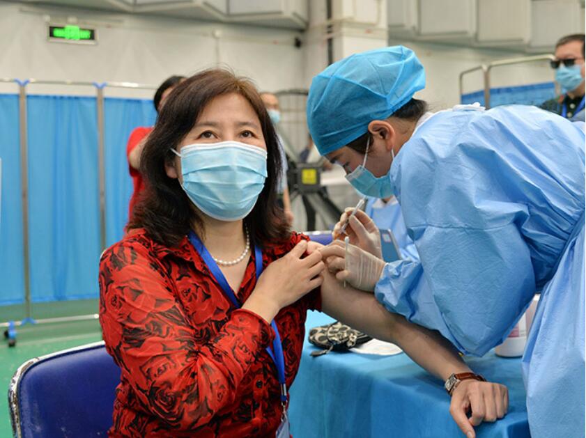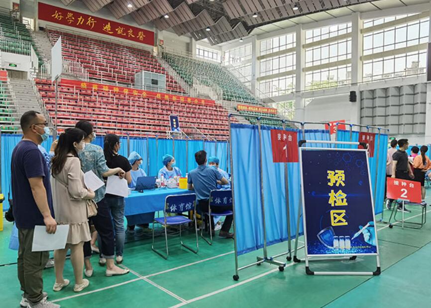 上午9时30分,接种正式开始。该校师生携带身份证在体育馆入口处有序排队,佩戴口罩、测量体温,等待接种新冠疫苗。接种点现场划分了候诊区、预检登记区、接种区、留观区、心理疏导区等功能分区,设置15个接种台,70余名医护人员参与此次接种。