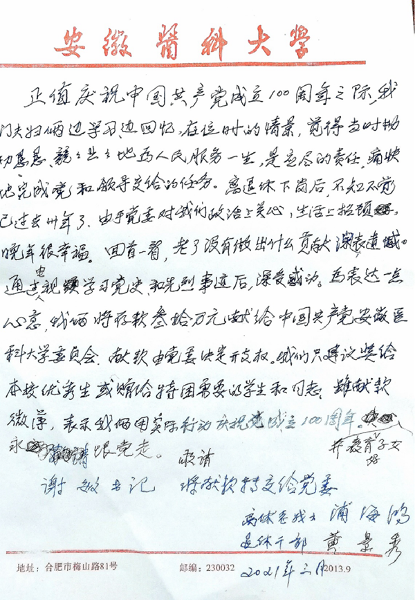 浦海鸿说,正值中国共产党诞生100周年,老夫妻俩边学习、边回忆,觉得参加工作时勤勤恳恳、兢兢业业的为人民服务是一生应尽的责任,痛快地完成了党和组织交给的任务。离开工作岗位后,浦老感动于党的温暖和学校的关怀,让夫妻俩安享幸福快乐的晚年生活。但总有遗憾,觉得离休三十年来自己没能再为社会、为学校做出贡献。党史是最好的教科书,通过学习党史,先烈们英勇作战、顽强拼搏的画面再次浮现在眼前,为感念党恩,浦老经过认真考虑,决定将积攒多年的离休金共计30万元捐赠出来,以实际行动庆祝中国共产党成立100周年。