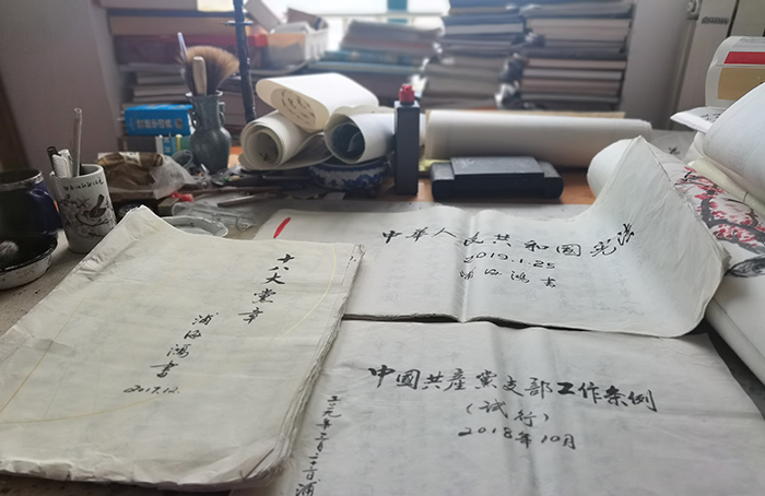 在浦海鸿老人的家中,我们看到了一本珍贵的《中国共产党章程》,这本封面已经有点破损的《中国共产党章程》手抄本,宣纸线装,整整111页。这是2017年党的十九大召开之际,时年87岁高龄的浦老用了整整一个月的时间手抄完成的,遒劲精致的行书镌刻着老人对党的一片赤诚之心。