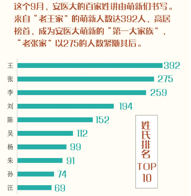 在年龄分布上,安医大今年新生平均年龄18岁,在这其中有26位16岁的同学和4位15岁的同学。在省份分布上,大部分同学都是来自安徽本省,高达3545人。在新生的姓氏上“王”、“张”、“李”依旧占前列,其中姓“王”的同学有392人,重名较多的是“王宇”、“王凯”等名字。