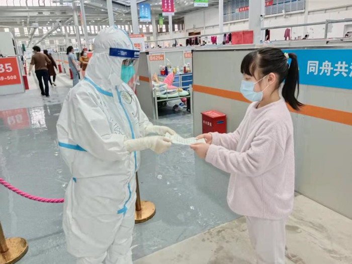 在B舱隔离期间,小朋友只有奶奶看护。刚来时,她很害怕,每天都想哭。后来,与医护人员慢慢熟络起来。在医护人员的陪伴下,正常生活,学习、玩耍,渐渐地,就不那么恐惧了。