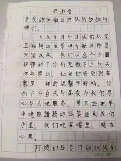4月11日下午,在上海崇明区复兴舱B区舱内,我收到了这样一封特别来信。“千言万语汇成一句‘感激、感恩’,感谢所有奋战在一线的抗疫人员,有你们真好!”这是一位九岁小朋友在奶奶的指导下所写的,之后亲自交给了我。