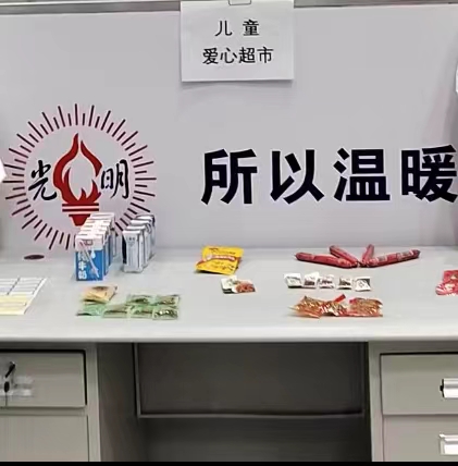 为了拉近和小朋友们的感情,方便与他们互动,我们特意在“心愿墙”边设立了“儿童爱心超市”,把我们携带的各种小零食,小礼品摆放在“超市”里。