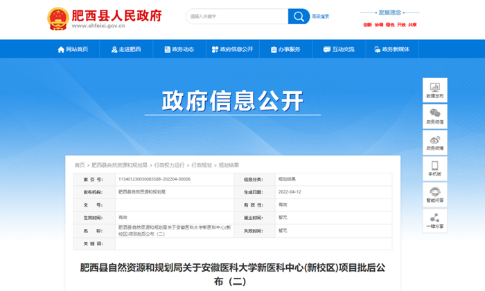 该项目位于肥西新片区,距合肥市中心约20公里。规划区北临深圳路,西临独秀园路,东临三公山路,南临李陵山路。规划区总占地面积约2001亩。建设规模约91万平方米,主要建设内容包含教室、图书馆、室内体育用房、学生宿舍(含留学生生活用房)、食堂、后勤及附属用房、文化艺术交流中心、医学博物馆、其他专业教室、实验室、地下车库及人防等。新医科中心(新校区)建设考虑分期实施,其中先行区建设规模约52万平方米。项目投资估算:约63亿元。