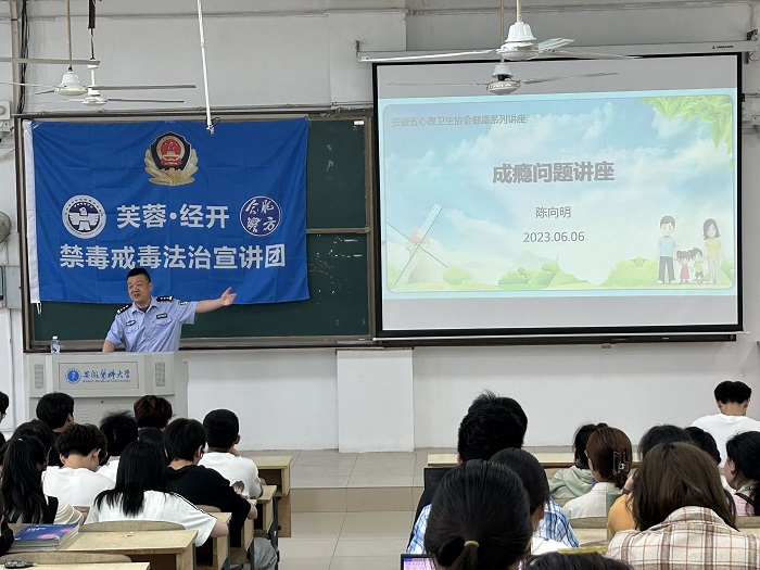 6月6日上午,精神卫生与心理科学学院在锡祺楼502教室举办禁毒教育“成瘾问题”讲座,进一步推进禁毒宣传工作,增强学生的禁毒意识。安徽省滨湖强制隔离戒毒所一级警长陈向明受邀担任主讲人。