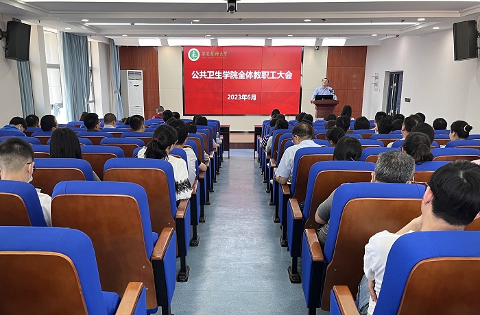 主题党课后召开教职工大会。该院执行院长王华介绍了主题教育期间学院领导班子调查研究工作进展状况。他勉励全体教师牢记习近平总书记关于公共卫生体系建设的重要讲话精神,同心同德、踔厉奋发,助力建设高水平公共卫生学院迈上新征程。