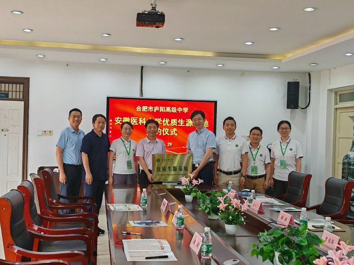 6月29日,生命科学学院院长周洪、院党委副书记贾伟华一行前往省级示范高中庐阳高级中学,举行优质生源基地共建协议签订与挂牌仪式。庐阳高级中学党委书记、校长裴劲,副校长杨怀明、武剑等热情接待。双方就优质生源基地建设和深化合作进行了热烈交流,周洪代表学校向庐阳高级中学授牌。