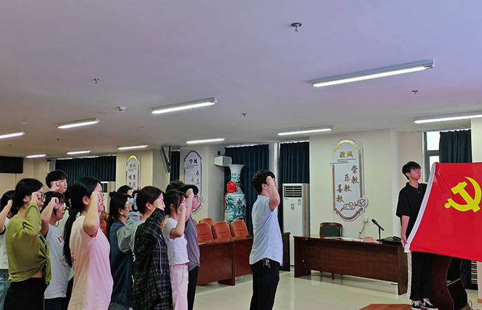 活动现场,庄严肃穆,全体起立,奏唱国歌。学生党支部书记带领新发展党员面向党旗,庄严宣誓。
