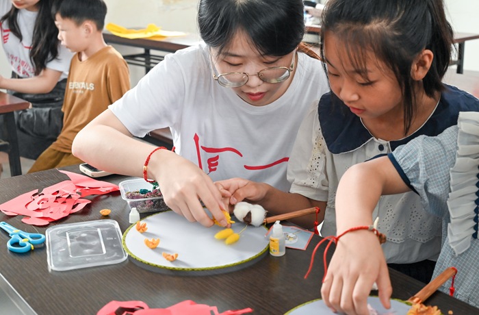 参与志愿服务,关爱留守儿童。实践团前往灵璧县虞姬镇灵光村村委会开展“七彩假期 情暖童心”志愿服务活动。活动吸引了辖区内50余名青少年儿童。实践团为孩子们捐建“七彩假期 情暖童心”爱心书屋,将50余本儿童读物、必备的学习用品、足篮排等文体用品赠予他们。同时,为了能够让小朋友们敞开心扉,团队成员还开展了喜闻乐见的趣味游戏活动,如五子棋、跳棋、乒乓球对打、剪纸、团扇制作等,营造愉悦欢快的现场氛围。为确保小朋友们能够高效完成暑假作业,实践团成员还投身于课后服务中,开展作业答疑辅导。