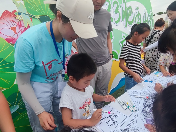 风吹荷动满池香,青禾手绘送清凉。7月15日,肥西县山南镇长庄举办第七届丰乐荷花文化节,队员们在现场开展结核病防治宣传活动。队员与孩子们一起进行“青禾·清核”结核漫画涂鸦,亲手绘制一幅幅结核病防治宣传漫画并挑选优秀作品现场展出,丰富的活动引得居民和游客纷纷驻足。一位小朋友在队员指导下完成漫画,她兴奋地说:“我要把漫画带回家,向我的爸爸妈妈爷爷奶奶讲解如何防治结核病,等开学后我还要把今天学到的知识讲给我的同学们听。”