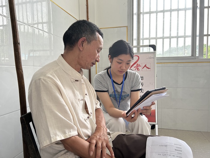 “青”情奉献,深入调研助力乡村振兴。实践团一行在扎根基层前,分别进行了问卷调查、实验室分装检测、健康档案建立等相关技能培训。实践期间,在金寨县疾控中心的带领下,队员们对居民们统一进行健康体检和慢性病调查,通过问卷了解村民的疾病史、日常饮食习惯、体力活动、睡眠习惯等信息,帮助他们进行血常规、尿常规、彩超、心电图等基本医疗卫生服务项目检查。此外,队员们根据居民健康状况建立信息档案,进行系统化的信息整理和统计,为社区居民提供有针对性的健康相关建议,通过可靠的数据支持,为乡村振兴注入青年“新血液”。