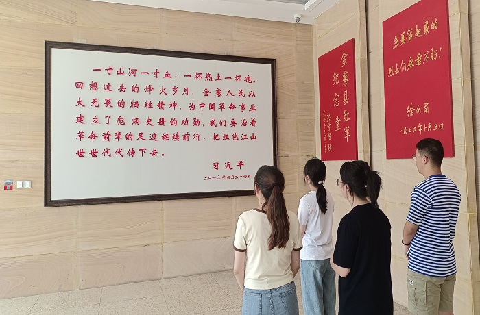 “青”春接力,红色足迹传承革命精神。实践团队全体师生怀着崇敬的心情,参观了金寨县革命博物馆。馆内,一块块展板,展示了波澜壮阔的革命历程;一段段文字,记录着南征北战的光辉历史;一件件文物,见证了戎马倥偬的烽火岁月。队员们从感人的红色故事、珍贵的文物史料中,真切体会到了金寨“一寸山河一寸血,一抔热土一抔魂”的光荣历史,并从耀眼的红色历史中汲取砥砺奋进的精神力量。大家纷纷表示,要坚定理想信念,赓续红色血脉,练就扎实本领,用实际行动践行“学达天下为公、行护健康之卫”的院训。