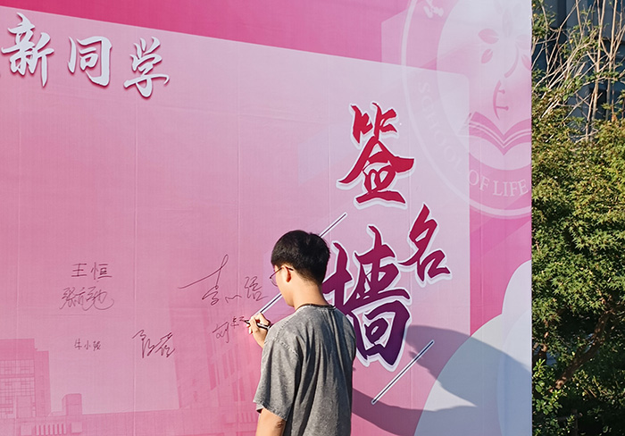 “在来学校的路上,我就满怀期待。到达学校后,志愿者们热情地帮助我们搬运行李,引导我们去报到地点。在学院的签名墙上,我还留下了自己的专属签名,学长学姐们还帮我们拍下了珍贵的留念照片。我觉得这些经历非常有意义。”生物科学专业的新生博鹏宇脸上洋溢着灿烂的笑容。