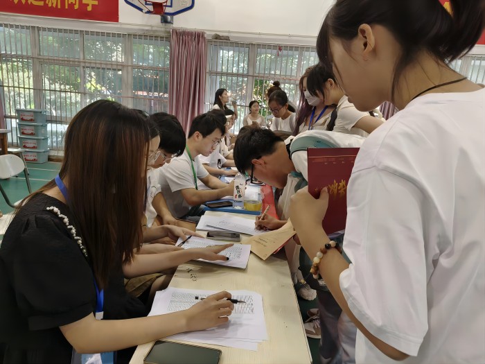 凝心聚力,服务至上暖人心。学院在南校区北门和西门分别设置服务站点,从入门到报到再到寝室的“一站式”报到路线,均有志愿者帮助指引,全体人员配合无间,轮流换岗,服务站点不间断运作,按照“确保不让一个新生落单”的要求顺利完成报到程序。迎新报到处设置带有学院标语的拍摄打卡点,便于学生和家长合影留念,爱心签名涂鸦版供新生签名。志愿者为新生们积极讲解防诈反诈知识,按照指导手册详细介绍新生安全须知,一对一指导帮助新生下载国家反诈中心,深化了新生防范电诈的安全意识。学院为新生准备了印有学院院徽和院训的帆布袋,装有包括《中华人民共和国宪法》、小风扇、水杯和钥匙扣等在内的专属大礼包,让新生和家长感受到学院的关爱。