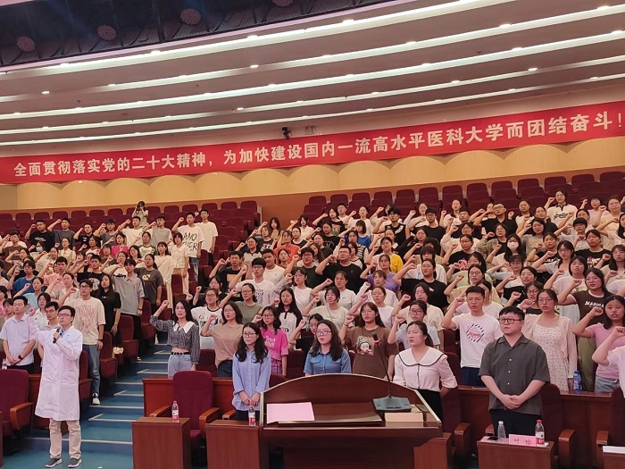 国家级青年人才称号获得者、该院博士生导师许尹教授带领2023级新生进行医学生宣誓。该院叶榕副教授作为校友代表发言,黄雨桐、杜赫分别代表本科生、硕士生新生发言。