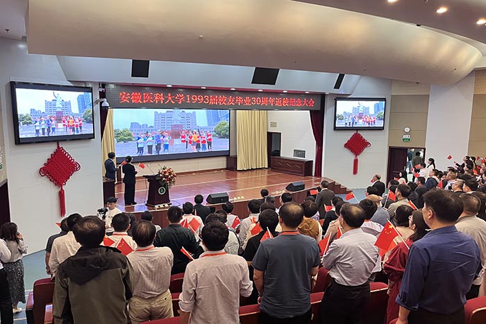 大会在雄壮的国歌声中拉开帷幕。肖圣龙代表学校向重返母校的各位校友表示热烈的欢迎,对校友们长期以来给予学校建设与发展的关心与支持表示感谢,并向校友们介绍了近年来学校在办学实力、人才培养、学科建设、科学研究、社会服务、校园文化建设、合作交流等方面取得的成绩。他表示,30年来,遍及海内外的1993届校友在各自岗位上始终铭记母校教诲,创新不止、奋斗不息,取得了令人感佩的成就,成长为所在行业、岗位的翘楚,为国家的医疗卫生健康事业发展和社会进步做出了杰出的贡献。校友们取得的成就不仅令母校骄傲,更让全体师生由衷为之自豪。