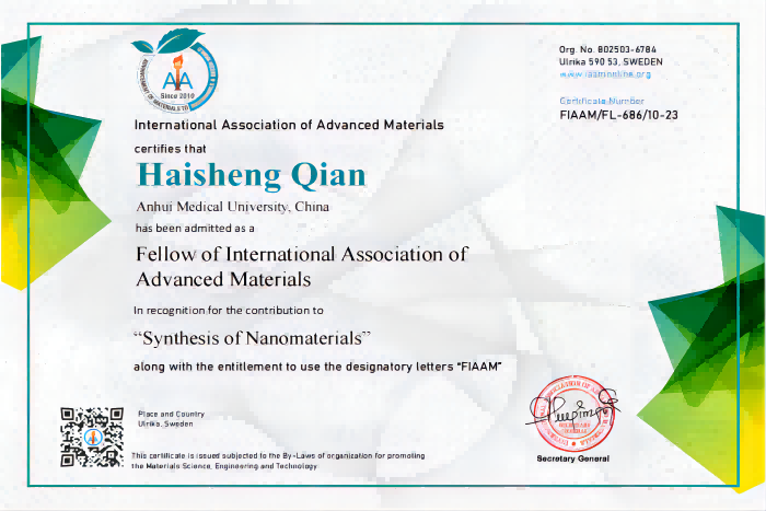 国际先进材料学会是全球先进材料领域的权威学术组织,聚集了世界范围内材料科学与技术领域优秀科学家,致力于为先进材料科学、工程和技术在世界范围内的快速发展提供平台。国际先进材料学会会士是国际先进材料学会授予研究人员和科学家的一项荣誉,授予在材料科学、工程和技术领域进行了独创且开展重要研究的科研人员或科学家。为表彰其在生物材料领域所做出的杰出贡献,学会授予其“国际先进材料学会会士”荣誉称号。大会上,钱海生受邀在线作了题为《无机纳米结构可控合成的生物医学应用(Controllable synthesis of inorganic nanostructures for biomedical application)》的报告。