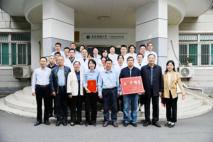 校工会主席惠继荣在仪式上宣读表彰文件,基础医学院党委书记储兵主持仪式。该院领导班子成员、校工会相关人员、人体解剖学教研室全体教师及研究生等参加仪式。(校工会)