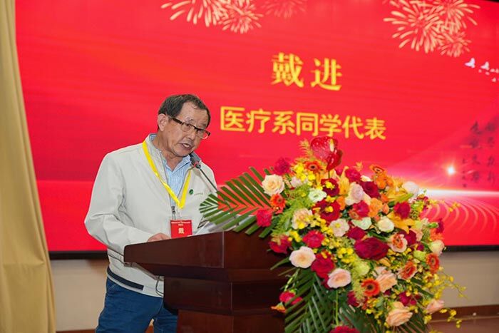 卫生系同学代表刘民、师资班同学代表邹浩军、医学系同学代表戴进分别发言。刘民表示将再一次从安医启航,继续发挥余热,为健康中国建设贡献安医力量;邹浩军用老照片再现了与母校的初见,勾起了所有校友的青春回忆;戴进对母校多年来取得的成就表示自豪,并回忆分享了大学时代的趣事。