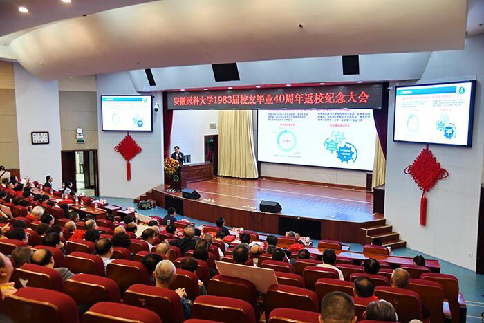 顾家山代表学校,向重返母校的各位校友表示热烈的欢迎和诚挚的问候,对校友们长期以来给予学校建设与发展的关心与支持表示感谢。结合一张张照片,顾家山带领校友们重温了大家在安医的时光。他表示,1983届校友的求学时光,是一个时代的记忆和符号。校友们处在时代的波澜壮阔处,人生的历程与国家发展的曲线高度吻合,一直向上向前。40年来,校友们见证、参与了国家的改革开放,更是卫生健康事业发展的实践者、推动者,为母校乃至全社会都作出了重要贡献。大家在各自领域谱写精彩人生篇章,扛起了属于安医人的时代责任,取得令母校骄傲、让全体师生自豪的成就,也涌现出了一大批杰出校友,是后辈们学习的榜样。