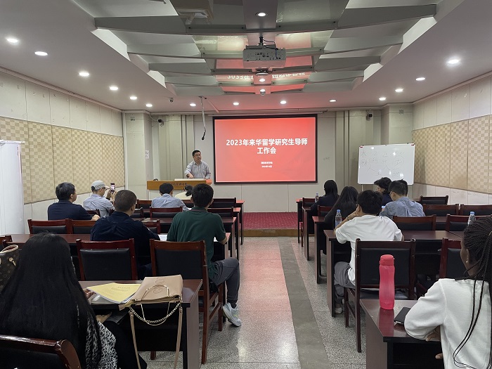 黄华兴对全体来华留学研究生表示热烈欢迎,向全体导师表示感谢,并就老生入境返校复学和2023级新生开学情况作了介绍。师生见面会后,他围绕“留学生管理及意识形态”作培训,介绍了留学生招生录取规范化流程、中外研究生趋同化培养的注意事项,强调了外事纪律及学校管理规定,并鼓励导师们积极指导留学生参加国内外学术交流活动。